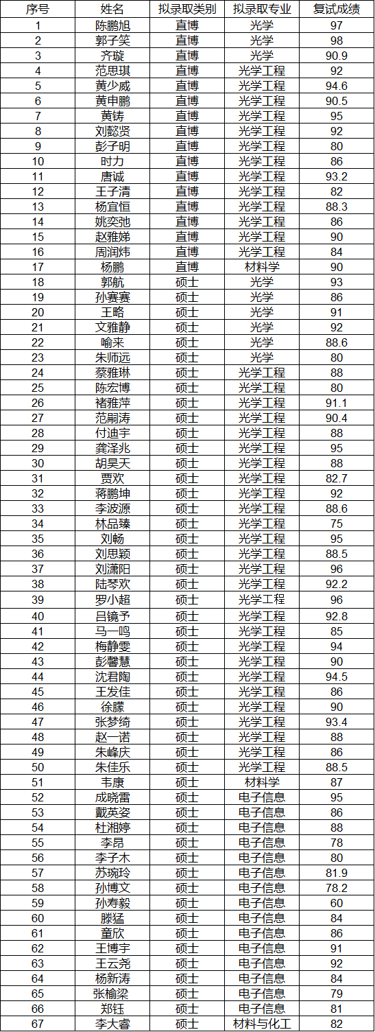 中国科学院上海光学精密机械研究所2023年推免生拟录取名单公示的通知
